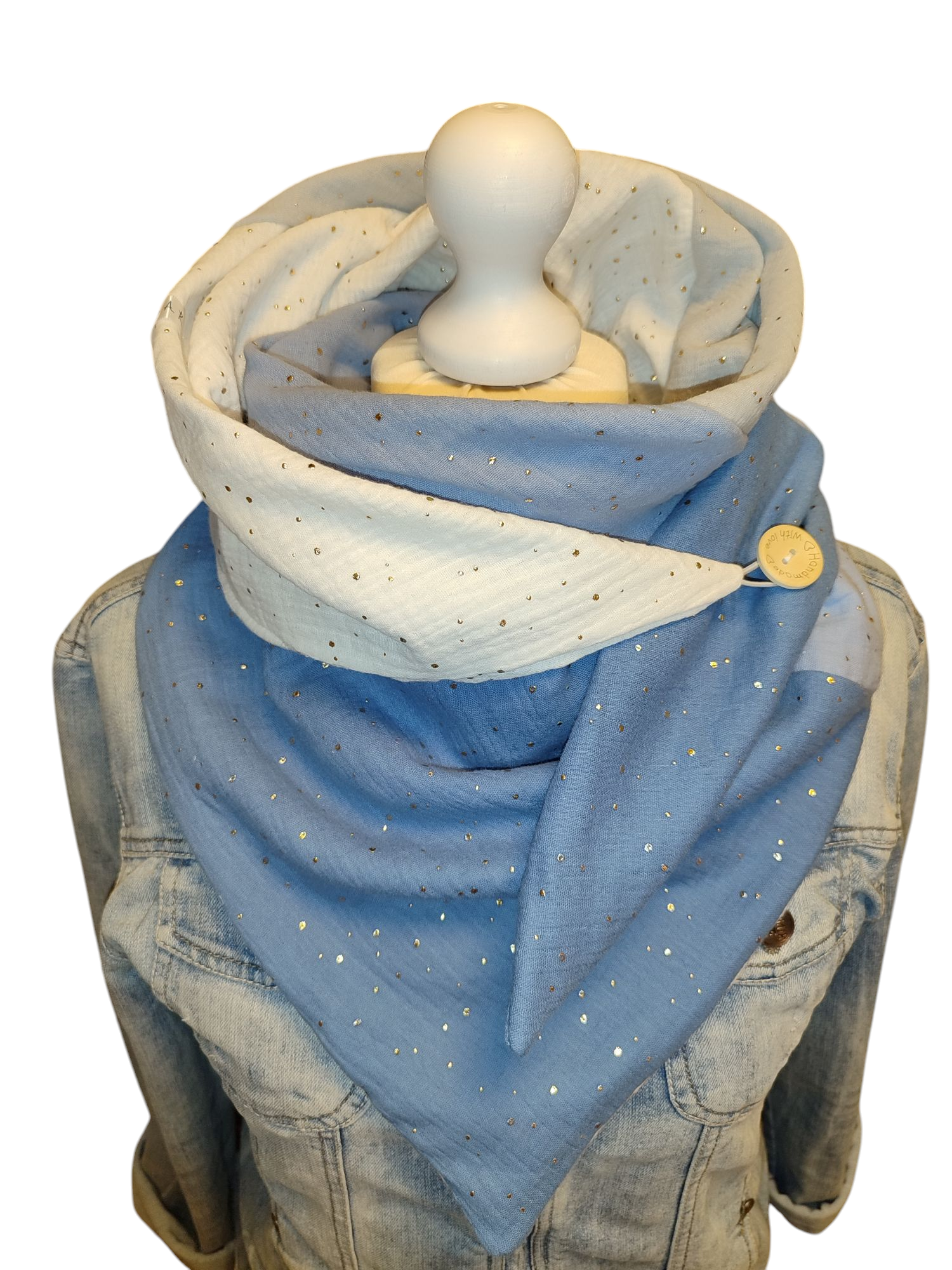 Es wird einfach um den Hals gewickelt und vorne bzw. seitlich mit der Schlaufe und dem Knopf verschlossen, dieser ist nicht nur ein Verschluss, es ist auch ein wahrer Hingucker.